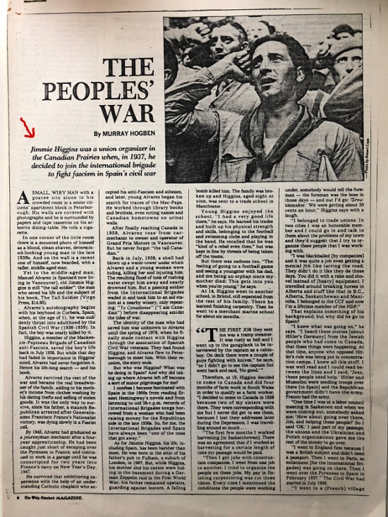 Ce récit de Jimmy Higgins appartient à un manuscrit inédit recueilli par Manuel Álvarez dans "Le grand soldat" et que le brigadier a partagé avec d’autres volontaires canadiens. Le texte a été la clé pour que l’Espagnol le trouve. À travers une circulaire de l’association des anciens combattants qui parlait de la recherche d’Álvarez, plusieurs brigadiers ont reconnu avoir lu l’épisode dans un article de Higgins.